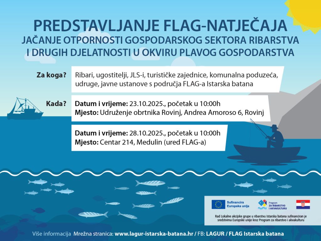 Ovim vas putem obavještavamo da je danas 17.10.2025. FLAG Istarska batana objavio natječaj za ribare, ugostitelje, obrte/tvrtke s registriranim/odobrenim objektima u poslovanju s hranom životinjskog porijekla, komunalna poduzeća, turističke zajednice, udruge i JLS-e s našeg područja (Rovinj-Rovigno, Vodnjan-Dignano, Bale-Valle, Barban, Fažana-Fasana, Kanfanar, Ližnjan-Lisignano, Marčana, Medulin i Svetvinčenat) „Jačanje otpornosti gospodarskog sektora ribarstva i drugih djelatnosti u okviru plavog gospodarstva“.